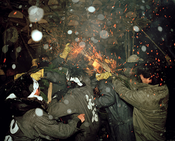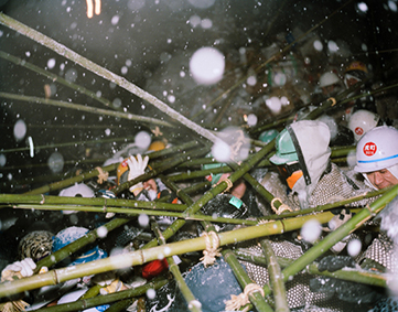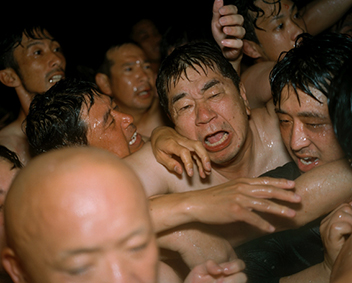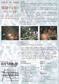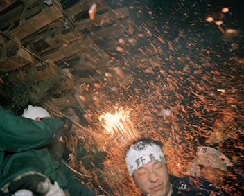 次は、「甲斐啓二郎|写真展 格闘する祭り−呼応する身体−」(2021年11月30日〜2022年1月30日、長野県野沢温泉村・高野辰之記念「おぼろ月夜の館 斑山文庫」)。今回の展示は、長野県野沢温泉の道祖神祭りで〈火付け〉を撮影した「手負いの熊」、秋田県美郷町六郷のカマクラ祭りの〈竹うち〉を撮影した「骨の髄」、全国のはだか祭りを撮影した「綺羅の晴れ着」の3部構成となる。