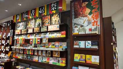 翌木曜日9日、大快晴の午後2時過ぎに、東京堂書店を再び訪問。サーカスの絵看板に囲まれながら、わが『新宿書房往来記』が新刊台に並んでいるはずだ。しかし、まだ本は来ていない。店内にある「Paper Back Café」でコーヒーを飲みながら、本の到着を待つことにした。そのうち、この日ここで待ち合わせをしていた教会の牧師の松元保羅さんと顔が合う。妻と義母が通う教会の松元牧師には、クリスチャンではない私も長い間ずいぶんお世話になっている。なんと牧師はわざわざ「新宿書房祭」と、この日にやってくる私の新刊を見にきてくれたのだ。だいぶ前に着いて、この東京堂書店の1階から3階までをくまなく回ってきたという。わたしたちは喫茶室でしばらく待つが、なかなか本は来ない。では今日はこれで帰ろう、その前にもう一回、「新宿書房祭」の書棚の下を通ることにした。なんと、あるではないか。わが新刊は色とりどりの本が並ぶ書棚の下で、クログロとまるで炭俵から取り出しだばかりの木炭のように蹲っている。書名と著者名が熾火のように、いや燻し銀(自分で言うか)のようだ。宇江敏勝さん、いい炭ができたよ。
