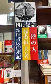 今日から東京堂書店神田神保町店で「新宿書房祭」が始まるのだ。在庫のあるものから130点を選び、300冊余りの本が並ぶことになる。開店の11時に合わせて、斜め前の東京堂書店に入る。左手の壁側、たくさんのサーカスの絵看板に飾られた書棚一面に新宿書房の本が並ぶ。壮観だ。一番上に横組みの大きな字で「新宿書房祭」のボード。最上段の棚には山の作家・宇江敏勝さんの本の表紙の顔が横一列に並ぶ。左手に短冊状のボード。上には港の人のシンボルマーク、その下に刊行記念の文字。そして縦書きに、右から「港の人 村山恒夫著 新宿書房往来記」と続く。実はまだこの本は新刊台には並べられていない。9日の午後には並ぶ予定だという。右奥の書棚の上には映画『七つの弾丸』の大きなポスターが掲げられている。富士川洋紙店の白石さんが、いつのまにか横に立っている。初日の一番にきてくれたのだ。彼にはずっと用紙のことでお世話になっている。「すごいですね、よかったですね」