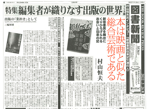 週刊書評紙『図書新聞』の第3536号(3月26日付、発売は3月19日)の1面、2面にわたって、『新宿書房往来記』著者インタビューが掲載された。聞き手は、元同紙編集長・現編集部スタッフライターの米田鋼路(よねだ・こうじ)さん。インタビューは2月14日に中野区白鷺の新宿書房で行なわれた。
