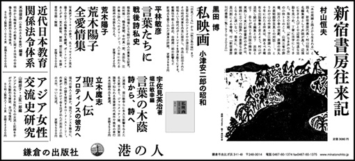 2時間あまりにわたる私のとりとめない話を、新宿書房を舞台にした、人と本とが往き来するひとつの出版交流の物語として捉え直し、メリハリのきいた『新宿書房往来記』の紹介文になっている。加えて、まるで村山ファミリーヒストリーのような構成にまとめていただいたのは、少々面映いが嬉しい。また、2面下には版元の「港の人」が大きな広告を出稿してくれた。